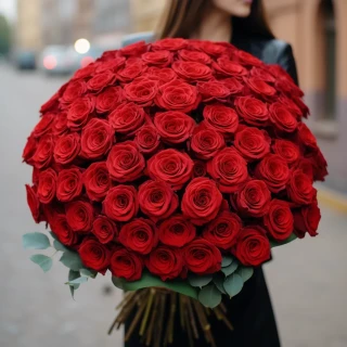 Этот великолепный букет из 101 красной розы - верх романтики и чувственности. Лепестки этих цветов отражают горячую искру страсти, а их аромат наполняет воздух неповторимым соблазнительным шлейфом. Этот букет способен растопить даже самое холодное сердце и подарить океан эмоций. Он выражает неповторимую красоту любви и сильные чувства, уносят в мир романтических мечтаний и желаний. Вечное восхищение в каждом бутоне, каждом лепестке. Это букет, который создает историю, погружает в океан счастья и оставляет незабываемые воспоминания.